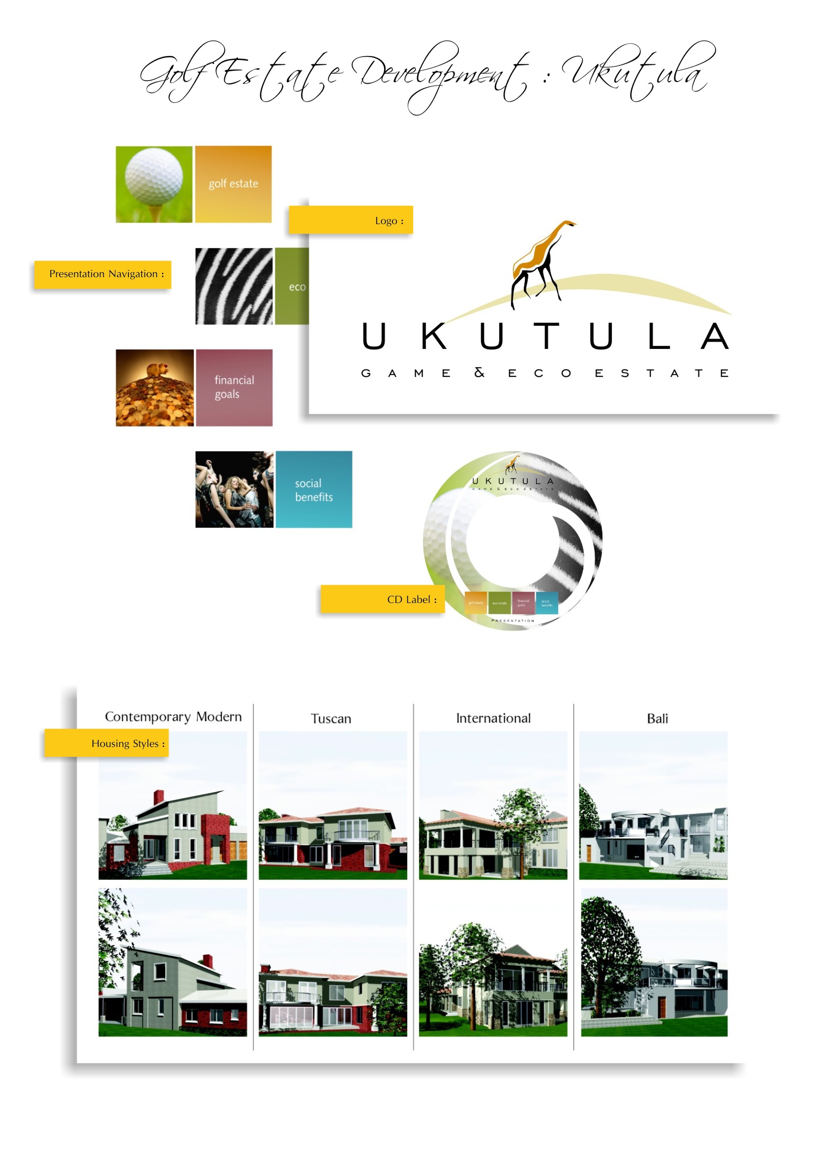 Ukutula Game & Eco Estate, known as the “place of quiet”, the lodge is nestled in lush bush veld where the roar of the lion can be heard for miles around. Scope of work included the development of an unique Brand Identity as well as presentation portfolio packs for the discerning investor that included a presentation folder with digital flythrough brochure featuring the available plot and plan sites nestled around the golf course and natural surroundings.